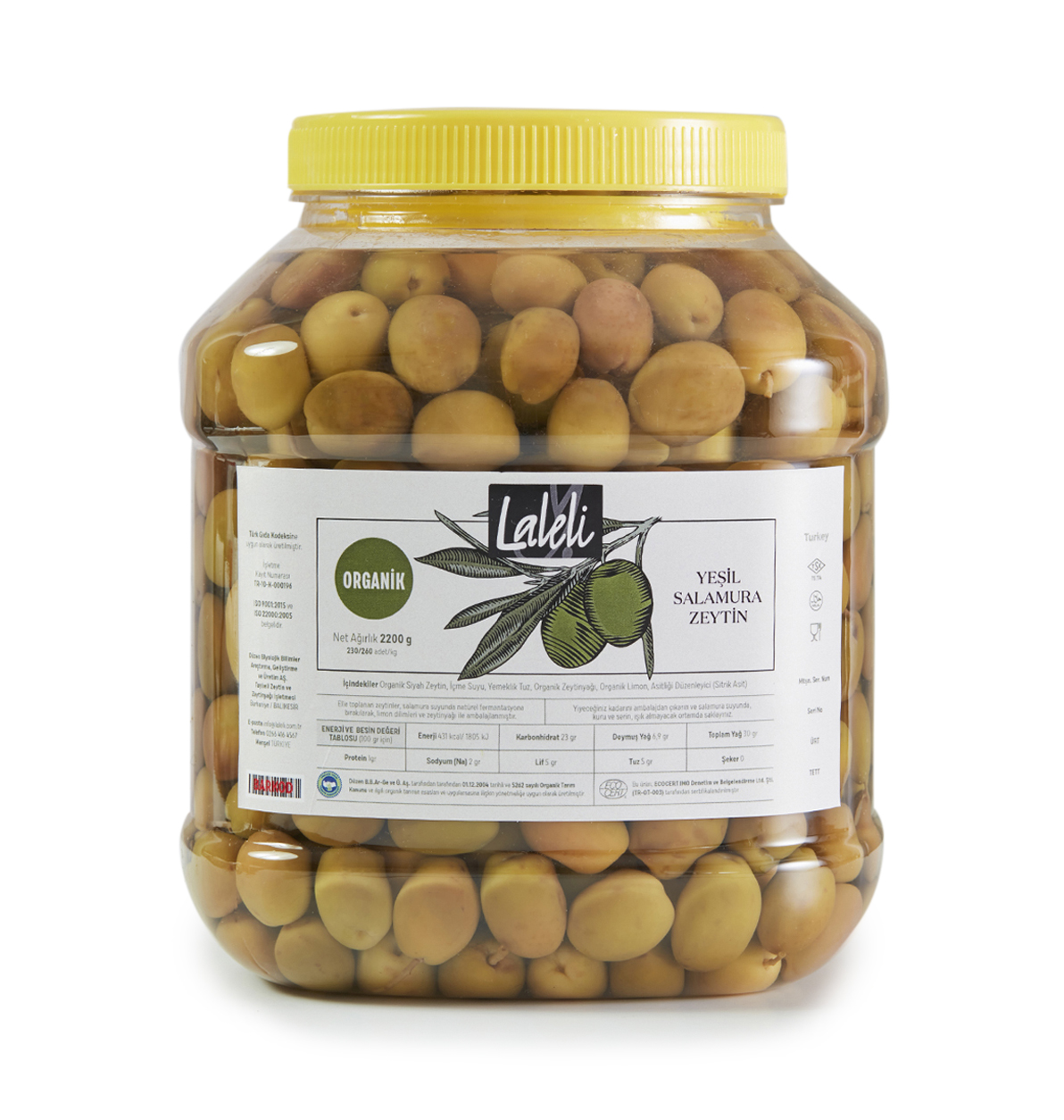 Organik Yeşil Salamura Zeytin 2,2kg. Pet Ambalaj (YENİ SEZON)